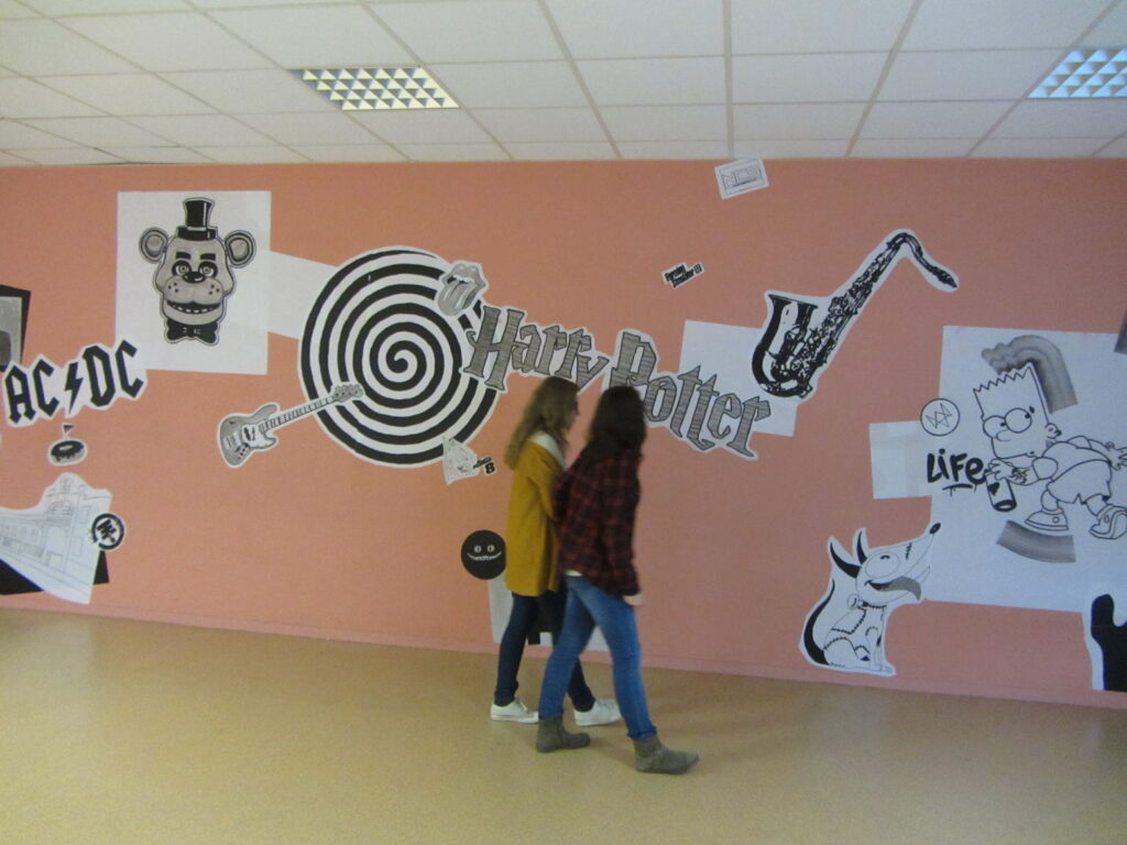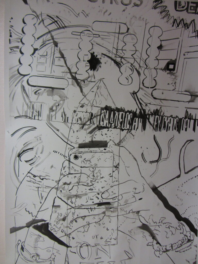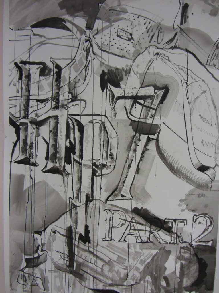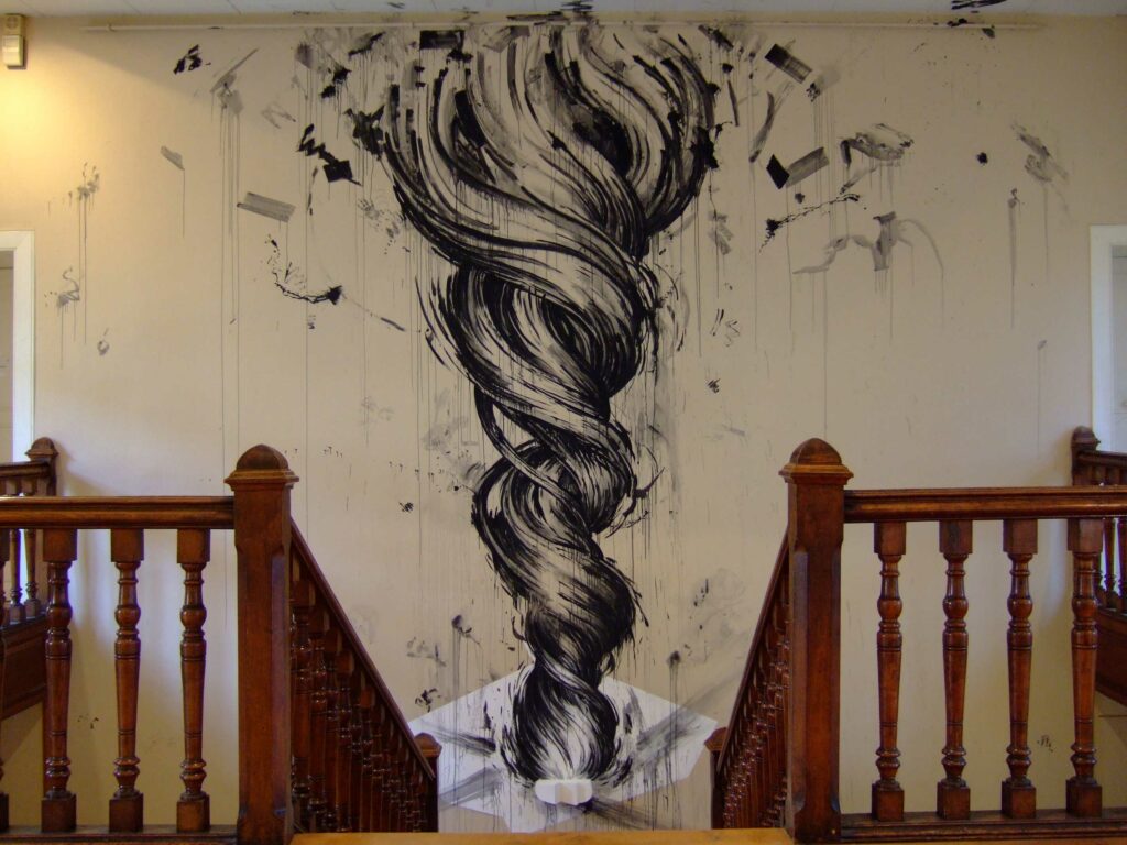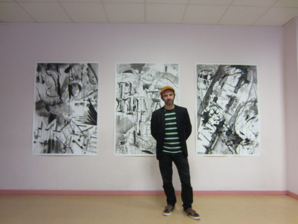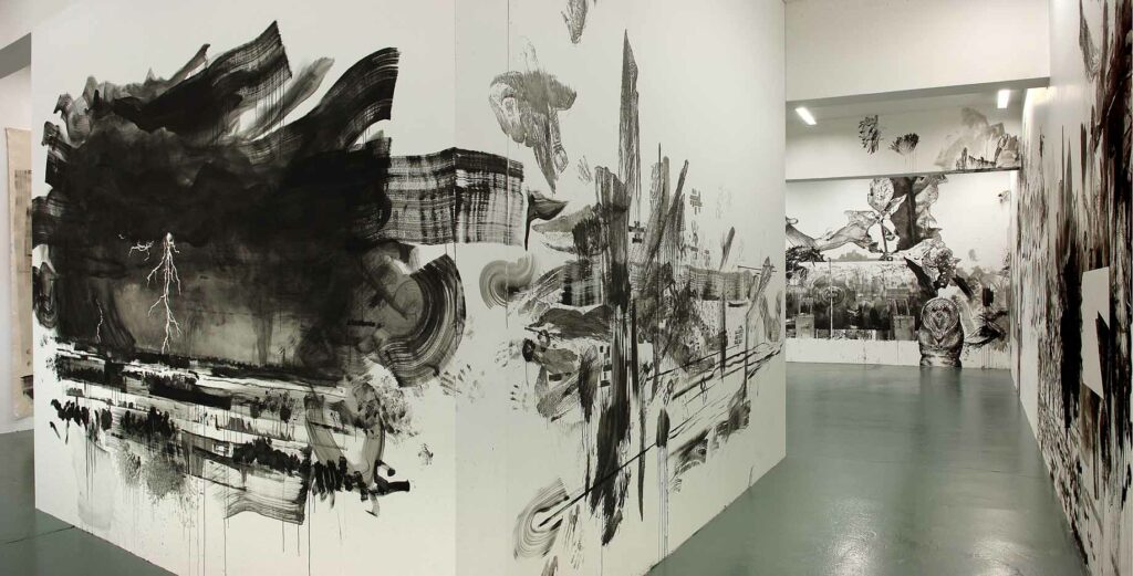 Ces éléments sélectionnés peuvent être moteurs de dessins ou de peintures (à l’acrylique noire sur toile ou sur mur) et, parfois, de volumes. J’élabore des univers proches de la science-fiction, menacés de dangers divers et peuplés de villes-fantômes. Les formes, scènes ou paysages représentés, se combinent la plupart du temps dans un aspect fragmenté, avec une dimension de prolifération. Les figures évoluent dans une atmosphère énigmatique et cinématographique. Réalisées principalement in situ, mes peintures s’adaptent au lieu dans lequel elles sont exécutées.