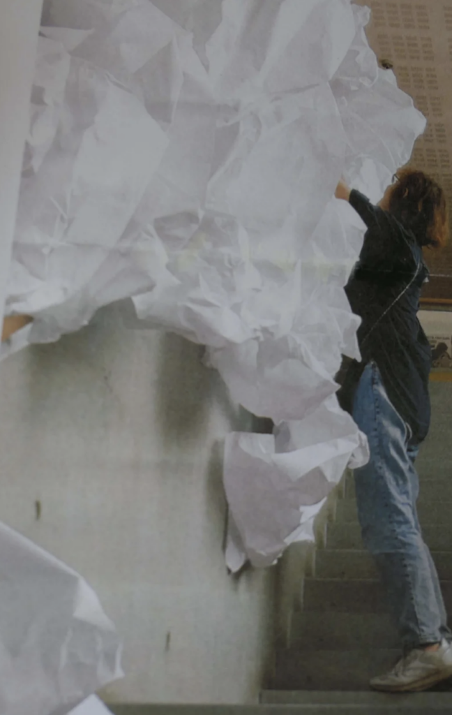 La rencontre en 1972 avec l’artiste brésilienne Lygia Clark et son enseignement sensoriel , corporel et collectif , sont de première importance dans son évolution . En 1986, circulant régulièrement entre Paris et la Bretagne , un travail nait de ce » vagabondage » , appareil de photo à l’épaule , les Cheminements : sols , talus ,arbres, paysages aperçus en train sont photographiés puis photocopiés sur de longues bandes de papiers puis glissées dans des rails de métal. Le papier , matériau fragile et éphémère , va prendre de plus en plus d’importance ainsi que l’architecture des lieux .