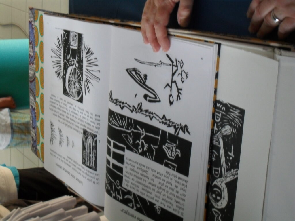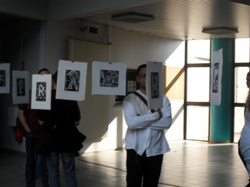 Tous les élèves (soit 19 classes) ont été amenés à visiter régulièrement l’atelier de l’artiste qui est intervenu plus particulièrement avec une classe de 6ème pour créer un « livre d’artiste unique » composé de gravures et de textes, fruit d’un travail interdisciplinaire français / arts plastiques. Riche en émotions et découvertes artistiques à travers les notions de diversité et d’altérité -fils conducteurs du projet- ce livre est à appréhender comme un espace de partage, un espace privilégié de rencontre entre l’artiste et les élèves.